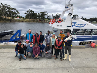 It's 4.30 and we're finally heading around the corner! The shearwaters are gliding past us in the wind and skimming over the waters choppy surface. It's a bit rolly with a southwest swell of 3 meters but everyone's in good spirits and looking forward to the adventure ahead. After leaving from Southport wharf we're heading towards Rechearche Bay. A wide and quiet bay with lots of cozy corners to shelter in from the weather. It's also where you'll find the site of a garden that was established by a French research expedition in 1792 who had friendly interactions with the local indigenous community. This is where the bay gets its name!