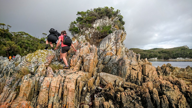 Now our boats are anchored for the night in a sheltered bay. On the shore the bush drops steeply down to jagged light-coloured rocks which are continually smashed by the waves.