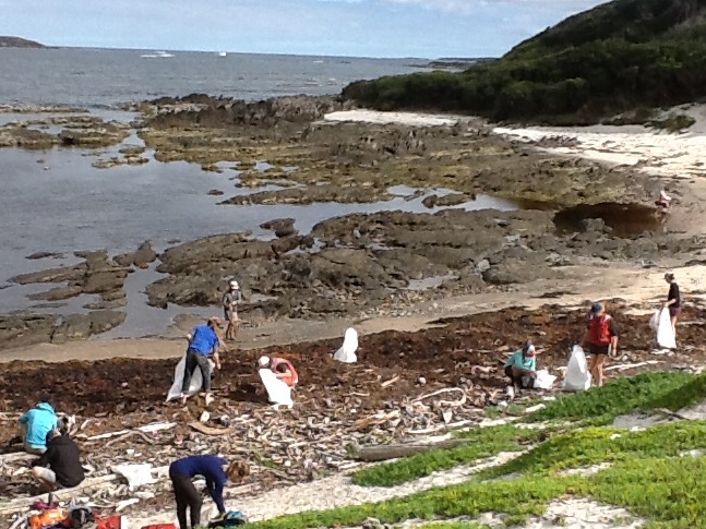 Following the rocky shoreline through a series small coves and jagged headlands of schist (a rock type), we collected the usual assortment of plastic bottles, fishing buoys, bait savers, and random plastic pieces, but as we rounded low scrubby headland into one of the larger coves along this stretch of coast we were stopped dead in our tracks.